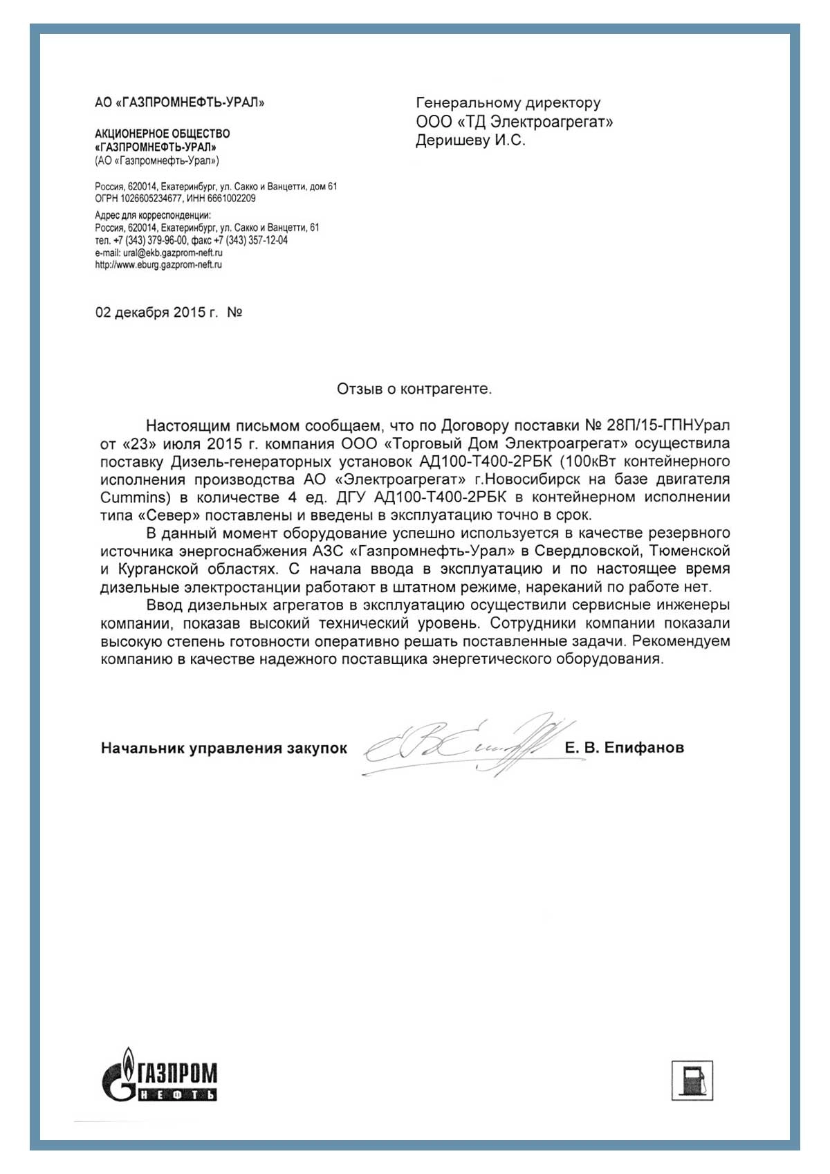 Настоящим письмом сообщаем, что по Договору поставки № 28П/15-ГПНУрал от «23» июля 2015 г. завод «Торговый Дом Электроагрегат» осуществила поставку Дизель-генераторных установокАД100-Т400-2РБК в количестве 4 ед. ДГУ АД100-Т400-2РБК в контейнерном исполнении  типа «Север» поставлены и введены в эксплуатацию точно в срок.