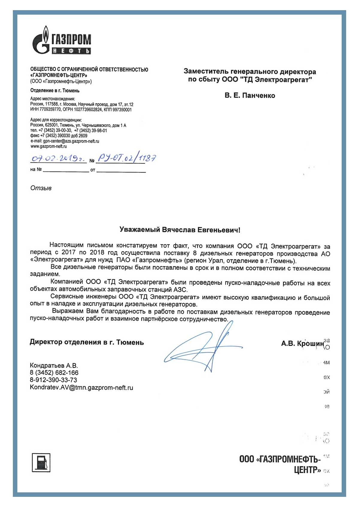[ALT] => Отзыв контрагентов о компании ООО «ТД Электроагрегат» и исполненном проекте для ООО «Газпромнефть-Центр»